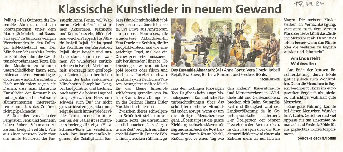 Das Münchner Ensemble setzt sich voller Genuss zwischen alle Stühle und verbindet ein vermeintlich alpenländisches Instrumentarium mit dem romantischen Liedrepertoire des 19. Jahrhunderts. Das Quintett, besetzt mit Hackbrett, Kontrabass Akkordeon, Klarinette und Gesang, hat mit diesem Stilbruch seine ganz eigene Tonsprache entwickelt, die sowohl in den intimen als auch in den überschäumenden Momenten einen einfühlsamen Ausdruck zulässt.